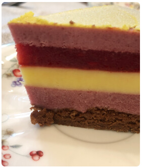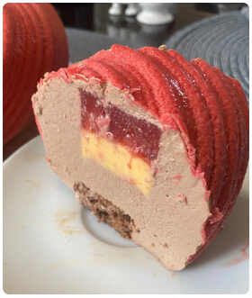 Состав: Бисквит Дакуаз с темным шоколадом Начинка: Клубничный компот и кремю манго-маракуйя